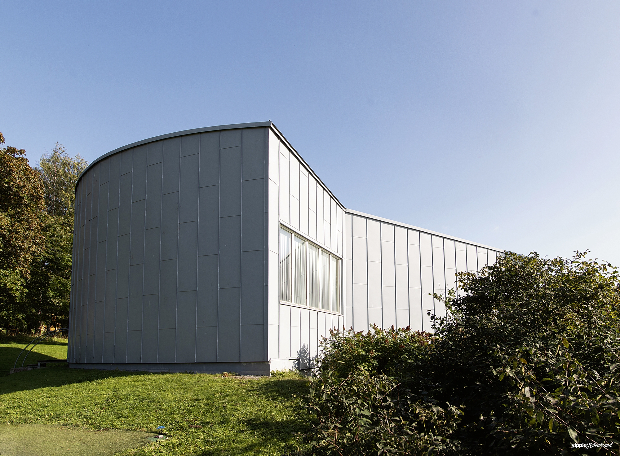 Den invändiga uppbyggnaden med cirkelformade gradänger gav också aulabyggnaden dess yttre form med sitt plåtklädda skal.