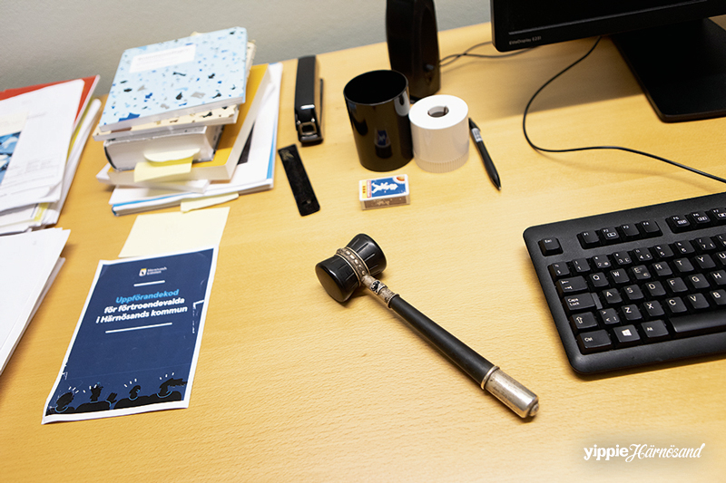 Rummet i övrigt är rätt ordinärt. Två fanor står hoprullade i ett hörn, Sveriges och Härnösands. Två standar tronar på mötesbordet, ett med Härnösand 400 år på och ett med stadsvapnet, ni vet, det där med bävern och gäddan. På väggen hänger en karta över Lungön.