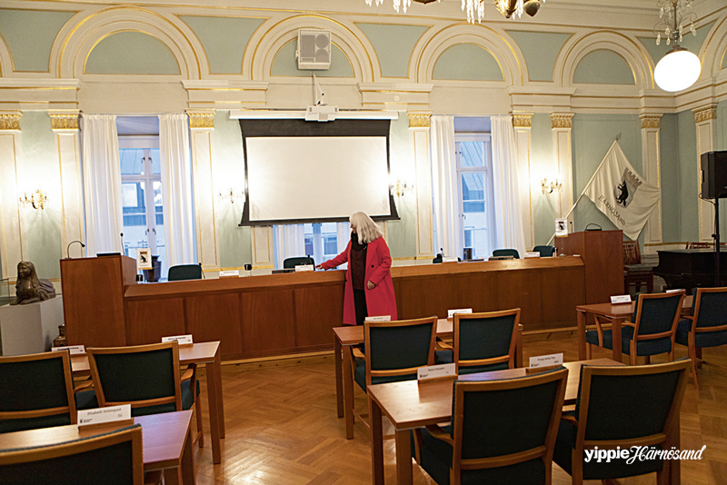 För att riktigt understryka det hela hittar vi en skylt i rådhuset där Monica Fahlén får posera. Här slås fast svart på vitt vad som gäller:
