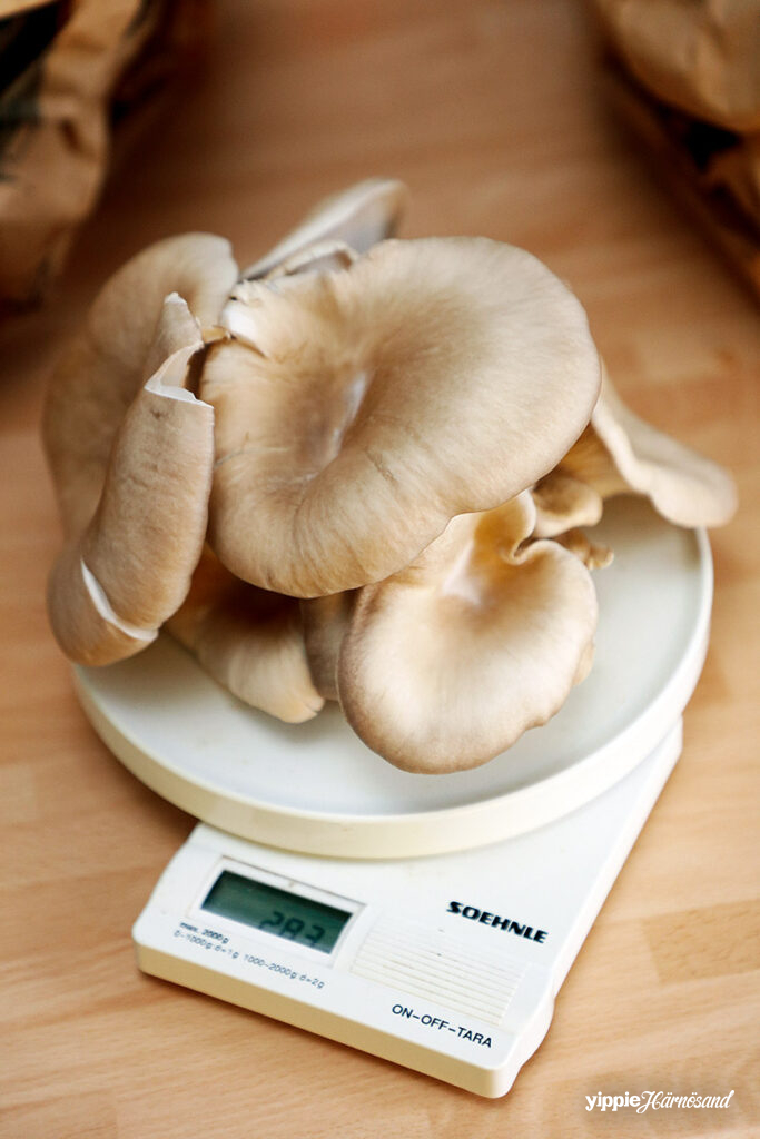 De visar hur det tar ungefär tre veckor för mycelet att kolonisera påsen i rumstemperatur, och det tar 4–7 dagar för svampen att bli fullväxt i 15–18 grader och bli vackra svampar som kan skördas, inte för sent, inte för tidigt.