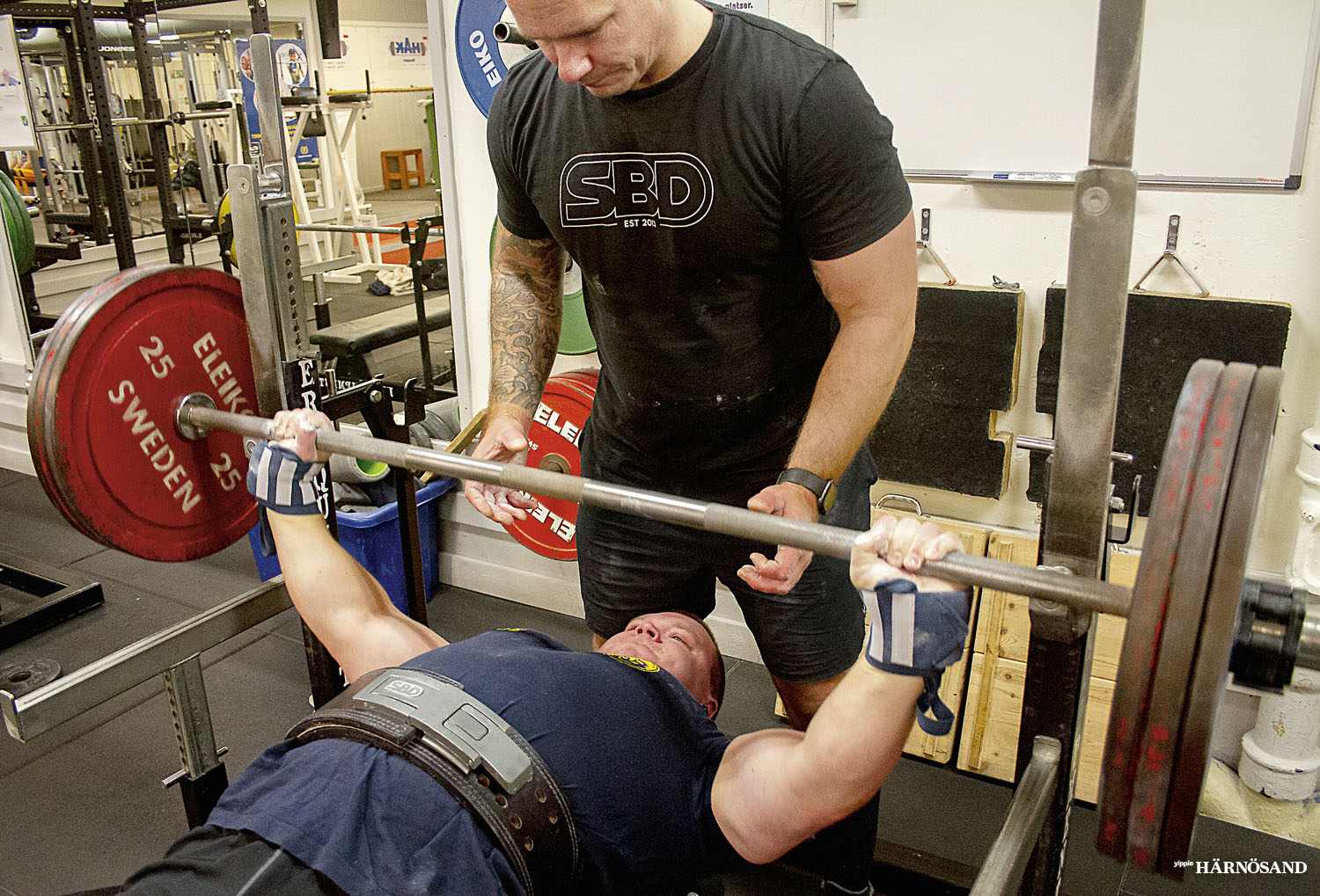 När vi är där gör Håkan en repitition på 17 gånger med 160 kilo på stången med Jimmy Grenblads bakom honom.
