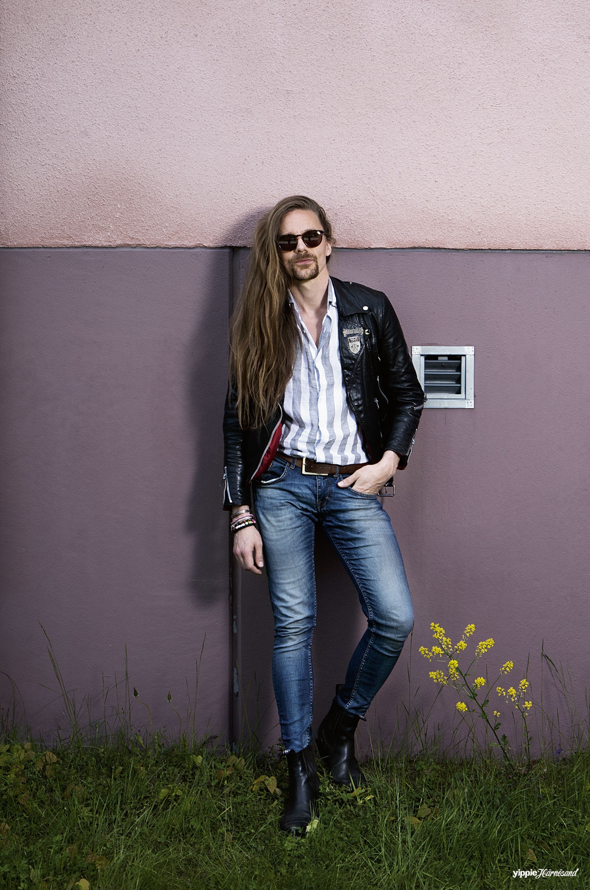 – Snobbigt rockig? Bohemiskt corporate’ig? Jeansen måste vara tajta. Skinnjackan måste vara Jofama (möjligen Petroff). Det måste finnas en kontrast. Det duschade ska gärna möta det oduschade och vise versa. Ska det bäras brandrelaterade tryck så är jag oerhört picky. Det finns knappt någon snygg merch som trycks idag utan vintage är nyckeln om det prompt ska bäras.
